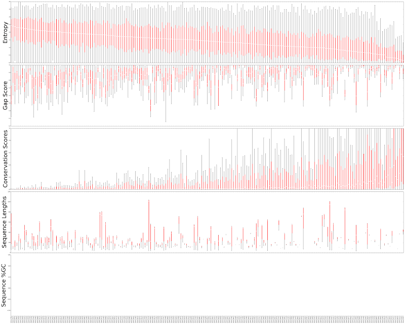 Figure 1. Locus statistics distributions for loci in the Whelan et al. 2015 dataset. From top to bottom, each box plot represent the distribution of entropy, gap score, conservation score and sequence length in one locus. Since the dataset is of protein sequences there is no %GC information. Entropy does not seem correlated with other statistics with the exception of conservation scores. Median entropy ranges between 0.16 and 2.44.