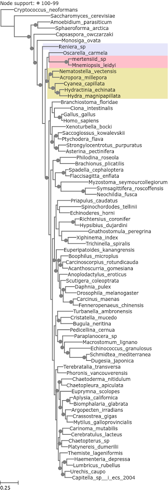 The most recent paper about the sister clade of Metazoa (Whelan et al. 2015), like its predecessor (Moroz et al. 2014), places Ctenophora as the first branching metazoan phylum. I have been out of touch with the topic for about three years (might as well been an eternity with the rate genomes are being sequenced) but I felt I had to do something about those cheeky party-crashing beasts (spoiler alert, they are still there, having sangrias on the earliest branch of the tree). More than that, I wanted to see how it feels to run a full-scale genomic dataset through ReproPhylo.