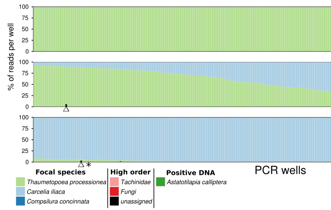 A key part of James’ project was to examine the parasitoids of invasive Oak Processionary Moth caterpillars. Since thousands of reads could be assigned to a single caterpillar he was able to detect both the host and parasite DNA. Through his careful optimisation this approach scaled to a couple of thousand individuals per MiSeq run, and this “Nested Metabaracoding” was written up (Kitson et al 2018). The point wasn’t to say “hey we invented something new” but rather to say that by putting together a number of known approaches a really useful protocol in ecology and evolution could be run in a normal lab. This gave novel ways to look at complex systems, incuding host-parasite systems, and numts.
